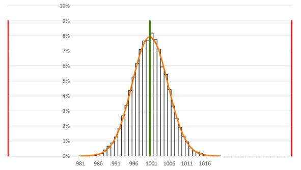 Теперь нужно нанести на диаграмму номинальный размер. Номинальный размер 1000 мм пересчитываем в координаты по оси Х: