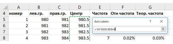 В качестве меток выбираем столбец значений центры интервалов группировки (рис. 8.6.12).