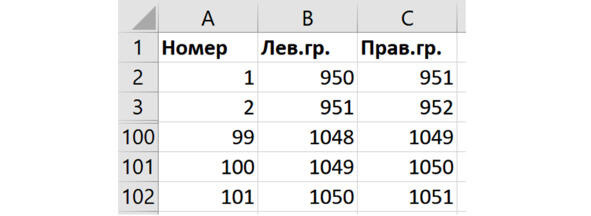 Чтобы график был немного шире, чем поле допуска, выбираем диапазон значений для группировки данных от 950 до 1050 мм. Ширина интервала группировки данных равна 1 мм. Создаём новый лист и сформируем таблицу границ интервалов. В качестве меток используем левые границы интервалов. Чтобы получить на графике крайнюю правую метку 1050, делаем последний интервал [1050, 1051), см. рис. 8.6.16.