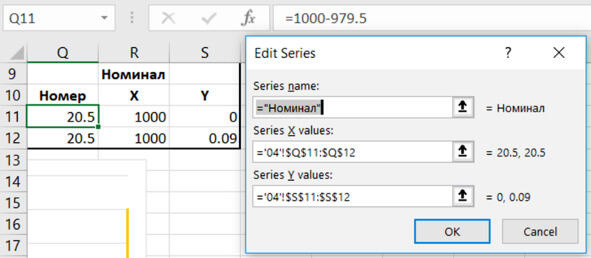В диалоговом окне Edit Series появляется возможность указать данные для оси Х в строке Series X values (рис. 8.6.7). В качестве «иксов» для графика выбираем колонку Номер в нашей вспомогательной табличке. «Игреки» Series Y values по-прежнему используют колонку Y нашей таблички.