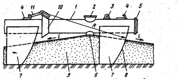 Рис. 2. Звено намывного пульпопровода с опорой и выпусками для рассредоточенного намыва: 1 стальная труба; 2 верхний люк с заглушкой; 3 чалочная скоба; 4 крюк соединительный; 5 уплотнительное кольцо; 6 нижний люк с заглушкой; 7 опора звена; 8 торец опоры; 9 намытый грунт; 10 конусный раструб; 11 соединительная скоба