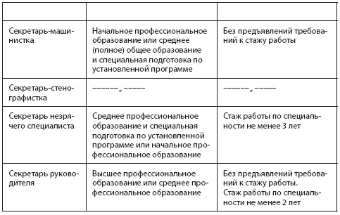 Требования к статусу также не очень высоки: только секретарь руководителя, имеющий среднее профессиональное образование, должен иметь стаж работы по специальности не менее 2 лет, а секретарь незрячего специалиста при начальном профессиональном образовании не менее 3 лет.