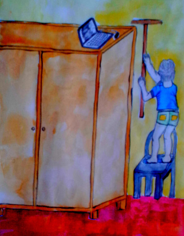 Петя включил телевизор, мультиков интересных не было. На дворе гуляли совсем маленькие дети, друзей не было, В игрушки Петя уже не играл, читать книжки тоже не хотелось. Скукота! И тут его осенило, достать ноутбук и немного поиграть на нём, Саша не узнает. Но шифонер очень высокий, даже встав на стул он не мог дотянуться до ноутбука. Саша сходил за деревянной шваброй и стал подвигать ноутбук ближе к краю. Ноутбук скользнув по гладкой поверхности шкафа с высоты и хлопнулся на пол. Саша оцепенел Всё! Саша надёргает за ухо, закроет в комнату на день-два, а мама, обещавшая подключить ему интернет, не выполнит своё обещание. Петя спрыгнул со стула, поднял ноутбук, потрёс его, не открывая, что-то внутри стукало, видно что-то оторвалось.