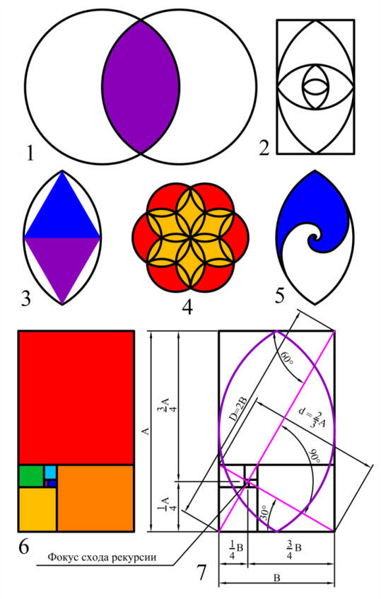 Схема 1. Весика Пискис. 1 построение из двух окружностей; 2 пропорциональное членение пропорцией; 3 схема с правильными равносторонними вписанными треугольниками; 4 базовый элемент Цветка Жизни с выделением фрагментов в форме Весика Пискис; 5 схема со спиралью, построенной в пропорции Весика Пискис; 6 прямоугольник с уменьшающейся рекурсией в фокус схода; 7 основные пропорции прямоугольника Весика Пискис с рекурсией.