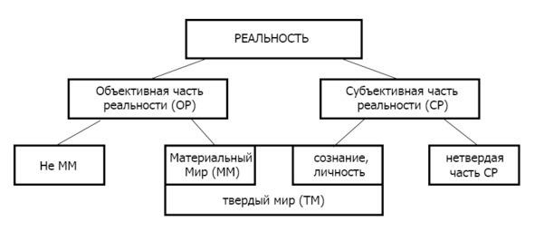 Теперь мы можем выделить область определения «материальный мир» (ММ), к которому относятся вещество и поля, изучаемые в физике, как частный случай ОР, то есть как её твердую часть. Обычно понятия ММ и ОР считаются эквивалентными, но я разделил эти понятия, так как в ОР существует ещё и область не материального мира (НеММ), которая вместе с нетвердой частью СР составляет нетвердую часть Реальности. Довольно легко назвать примеры объектов, расположенных в ММ как части ТМ в ОР, это любые предметы, которыми мы пользуемся в быту. А вот есть ли примеры НеММ в области ОР? Их можно найти даже в физике, если начать углубляться в глубины квантовой механики, например, все то, что меньше длины Планка. Кроме того, напомню, что ОР я определил всего лишь через существование, не зависимое от сознания человека. То есть в области НеММ находится много чего не материального, например, неорганики из книг Кастанеды, и даже определенная часть конструкции под названием человек. Но мы пока не будем заострять на этом внимание. Так же легко понять, что множество процессов в нашей голове воспринимаются нами через рефлексию, что является признаком твердого мира, находящегося в области СР. Например, мысли и чувства в области сознания, личность и все то, что непосредственно связано с её функционированием. На первый взгляд довольно странно называть все это твердым миром, однако это действительно наблюдаемая нами твердая часть субъективной области реальности. А вот описать наполнение нетвердой части СР довольно проблематично. Сюда относится очень глубокие области подсознания, например, уровень архетипов, хотя некоторые архетипы непосредственно проявлены в твердом мире. В эту же область можно отнести те планы восприятия реальности, которые не входят в нашу картину мира. Например, висцеральный план, витал, чакры и прочее. Однако сущностное пространство человека относится к объективному нематериальному миру, так как появляется при рождении человека, и после его смерти распадается постепенно, как и наше физическое тело. СР связана с самим субъектом, с его сознанием и самостью.