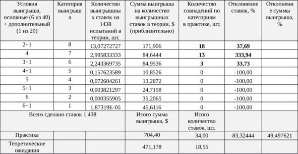В таблице 5 приведены вероятности выигрыша призов различной категории и распределения денежных призов. Правила игры следующие: игрок выбирает шесть основных номеров от 1 до 40 и один дополнительный номер от 1 до 20. Для того чтобы выиграть самый маленький приз, необходимо совпадение 2 основных шаров и 1 дополнительного. Для получения максимального приза необходимо совпадение всех 6 основных шаров и 1 дополнительного шара. Тиражи проходят 1 раз в неделю по четвергам, и они допускают участие иностранных граждан к игре и покупку билетов через интернет. Игру я вел с небольшими перерывами, начиная с тиража 919 от 26.12.2013 до тиража 973 от 08.01.2015. Всего за данный период мною было куплено 98 билетов, которые содержат 1438 ставок (независимых испытаний). Потрачено на игру 1352$, из которых 704,4$ выиграны. Всего из своих личных средств израсходовано таким образом 647,6$. Прямым делением суммы на количество ставок стоимость одной ставки не определить, так как на сайте их цена зависит от количества ставок в билете. После кризиса 2014 года цена ставок сильно подросла и играть стало довольно накладно, да и энтузиазма поубавилось. Высокая нагрузка на работе также не способствует продолжению опыта. В связи с чем я и решил подвести итоги. Ставки совершались по следующему принципу: числа брались из моих сновидений, если не хватало, то дополнительно выбирались случайно. На тираж я старался тратить не более 10$, но если выигрывал, то все выигранные деньги тратил на ставки в ближайших тиражах. Перед сном я пытался настраиваться на интересующий меня тираж с целью получения основных номеров. Дополнительный номер меня не интересовал, чтобы не было путаницы, какое из полученных чисел куда ставить.