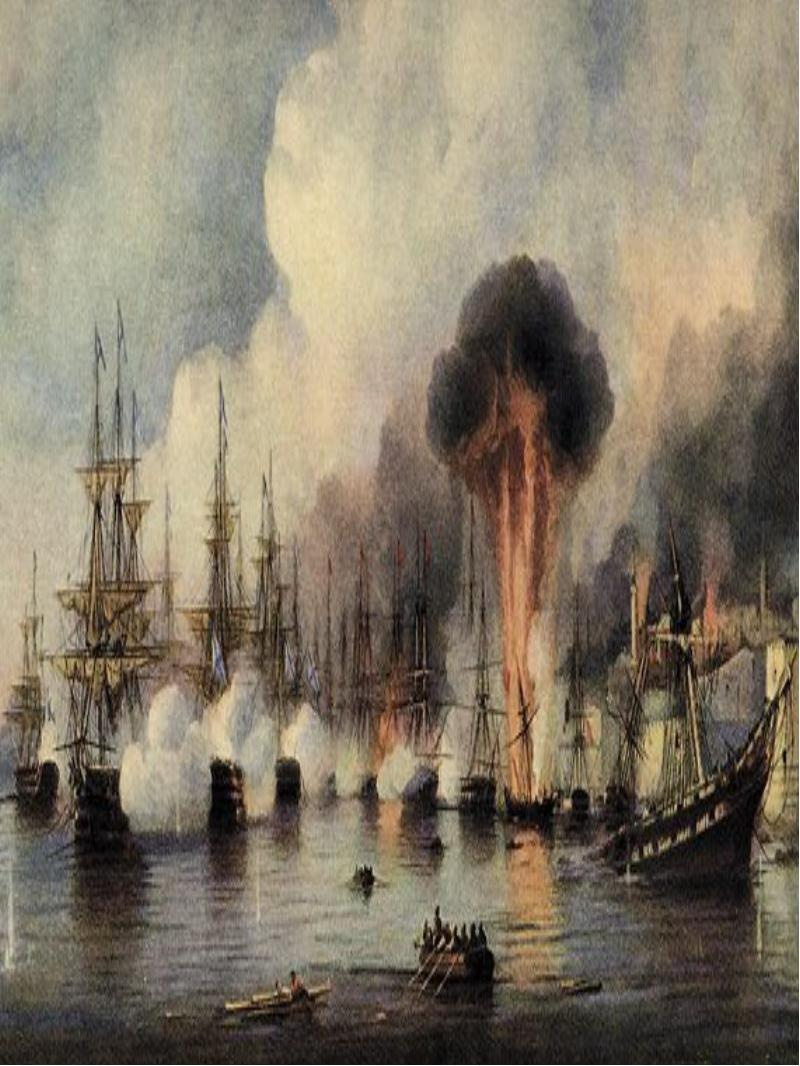 В рядах транспортных судов началось движение. Корабли разворачивались, собираясь выйти из залива. По бокам начали выстраиваться фрегаты и линейные корабли. Но выйти им не дали. Сначала сработало шесть мин, показав супостату, что не всё так просто. Когда конвой остановился, не зная, что дальше предпринять, в залив вошли наши корабли. Не знаю, кто первым подал эту идею, но выглядело это эффектно. С верхних палуб, в небо, взвились сотни ракет и упали прямо по курсу конвоя. В каких-то 2-3 сотнях метрах от кораблей и судов, широкой полосой запылало море. Стреляли тряпками, которые пропитали греческим огнём. Противник стал убирать паруса и спускать флаги.