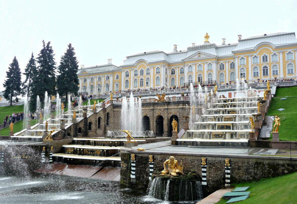 Каскад состоит из 64 фонтанов, грота и трёх каскадов в виде гигантских лестниц с семнадцатью водопадными ступенями. Его украшают 37 статуй, 29 барельефов и более 150 разнообразных декоративных элементов (маскаронов, дельфинов, львов, лягушек, герм и кронштейнов). Среди скульптур каскада вы сможете найти Галатею, Юнону, Германика, Ганимеда и других представителей античности. Фасад Большого каскада тянется на 42 метра!