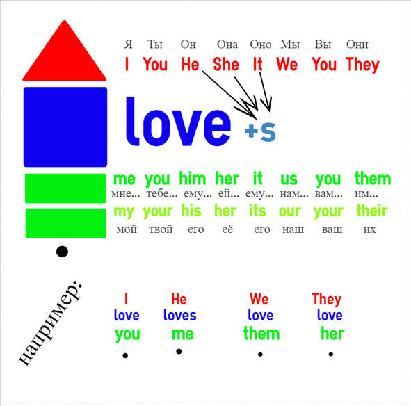 Чтобы начинать строить предложения, нашему конструктору пока недостаточно запчастей. Есть только синие кубики. А нам нужны и красные, и зелёные. Самые необходимые из красных это местоимения.