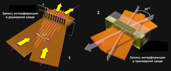 Интерференция когерентных лучей: 1 в схеме Лейта; 2 в схеме Денисюка