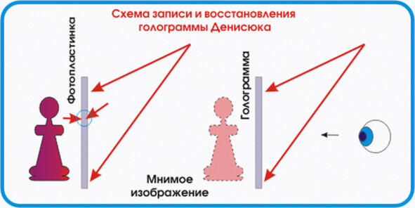 Схема регистрации голограммы, когда фотопластинка с прозрачной фотоэмульсией устанавливается между объектом и источником света, с тех пор носит имя Денисюка.