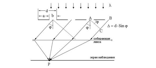 а ширина щели; b ширина непрозрачной части. Угол φ угол отклонения световых волн вследствие дифракции. Наша задача определить, что будет наблюдаться в произвольном направлении φ максимум или минимум.