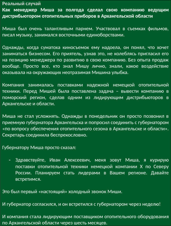 И главное. Так называемые холодные звонки это реально перспективное, интересное и часто очень веселое занятие. Если перед звонком представлять себе возможный конечный результат крутой интересный проект, многолетний контракт, великолепный корпоратив что бы Вы ни продавали, каждый звонок становится Приглашением-в-Радость.