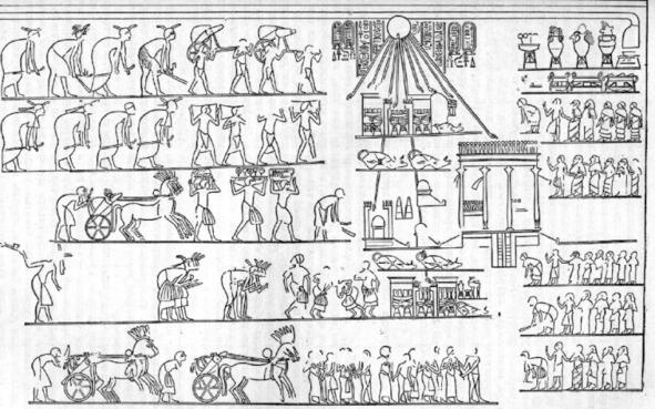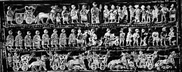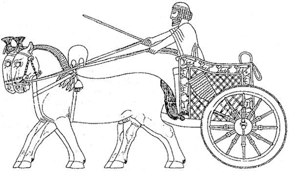Колесницы и изображения коней из Аркаима (1, реконструкция), Персеполя (2 Иран), Египта (3), Шумера (4):