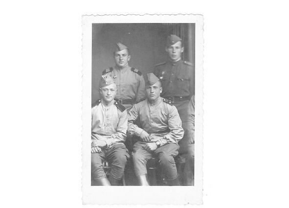 Был призван в Красную армию в мае 1943 г. в неполные 18 лет, после прохождения учебных курсов артиллериста и исполнения 18-летия был направлен на 1-й Украинский фронт, с которым прошёл весь боевой путь, день Победы 9 мая 1945 г. встретил в освобождённой Праге. После завершения ВОВ проходил срочную службу в Германии. На фото отец (сержант) с боевым расчётом.