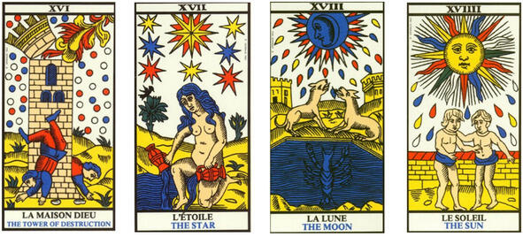 Изображения на картах с 17 по 19 Звезда, Луна, Солнце рождают ассоциацию с «фонтаном Меркурия» структурой «Верхнего Мира» (см. /2/ и рис. 12).