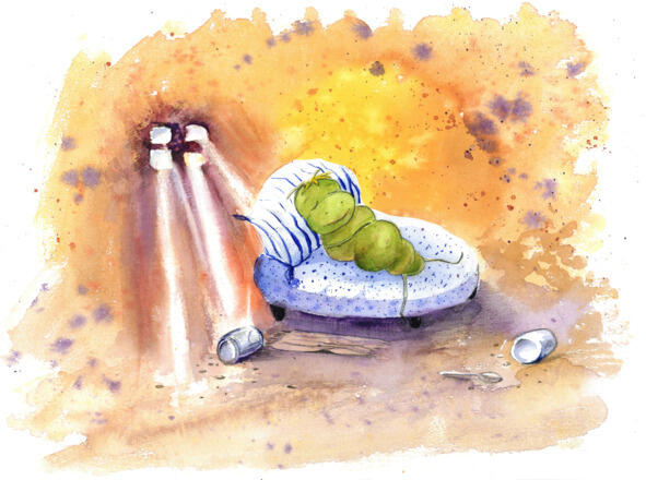 Червячок посмотрел на мусорный бак, который стоял за калиткой, над ним роились такие же зелёные мухи и ветер доносил оттуда неприятный запах. Сене туда совсем не хотелось.