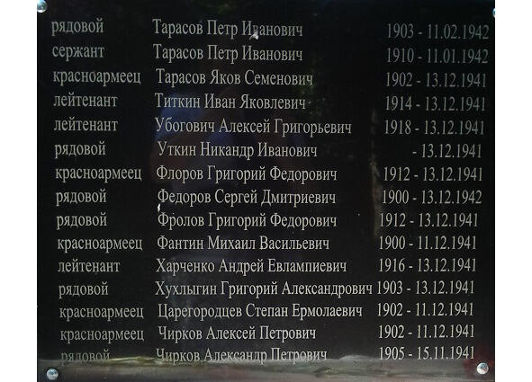 Агеев Федор Никитович-красноармеец 3 батальона 1089 стрелкового полка 322 стрелковой дивизи, 1901 г.р. уроженец Горьковской области Фоминского района, Гришинского с/с деревни Рожково. Погиб в бою под деревней Криволучье, у села Дедилово 13.12.1941.
