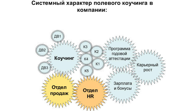 В этих условиях конечный результат зависит не от одного линейного менеджера, а от большого количества разных должностных лиц со своими интересами и спецификой работы. Именно поэтому в компании так трудно бывает запустить механизм качества полевой работы медицинских представителей, чтобы «шестеренка» полевого коучинга, соприкасалась и приводила в действие «шестеренки» других важных процессов. Давайте попробуем разобраться в этом механизме на основе приведенного ниже рисунка.