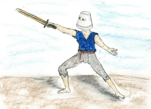 Да подтвердил малец и, надев на голову старое железное ведро с двумя отверстиями для глаз, выхватил из-за пояса свой деревянный меч. Размахивая деревяшкой, парень стал сражаться с невидимыми врагами, поражая одного за другим.