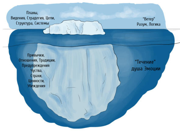 Та рациональная часть проекта, которую мы обычно видим, это всего лишь макушка айсберга. А его основная часть, скрытая под водой, это наши привычки, страхи, сомнения, наши эмоции и переживания. Именно эта подводная, человеческая часть и сопротивляется переменам: мы не в состоянии моментально адаптироваться к новым условиям. Для того, чтобы начать адаптироваться, изменения необходимо принять.