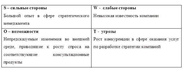 Условный пример фрагмента SWOT-анализа для нашей компании, оказывающей услуги управленческого консультирования, представлен ниже: