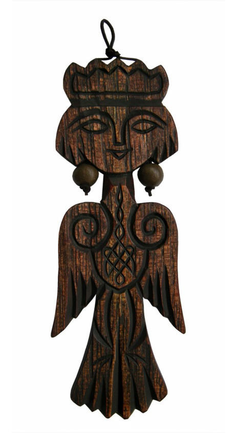 Сирин, Берегиня, Вещая Птица имена одной из трех птиц византийских и славянских легенд. Вещий Сирин несет в дом знак Солнца, предвещая ему и его обитателям благоденствие и счастье. На фото изделие мастеров промысла «Кезер»