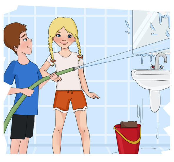 Тем временем, в группу вошла Валентина Анатольевна. За стенкой бурлила вода, а Саши и Вовы в кроватях не было. Тогда воспитательница решила проверить, не случилось ли чего. И, наверно, пожалела об этом. Впрочем, последнее нам точно не известно: в жару ей пришлось невольно освежиться мощной струёй прохладной воды, вырывавшейся из шланга, которым предприимчивые помощники-подготовишки безуспешно пытались вымыть зеркало