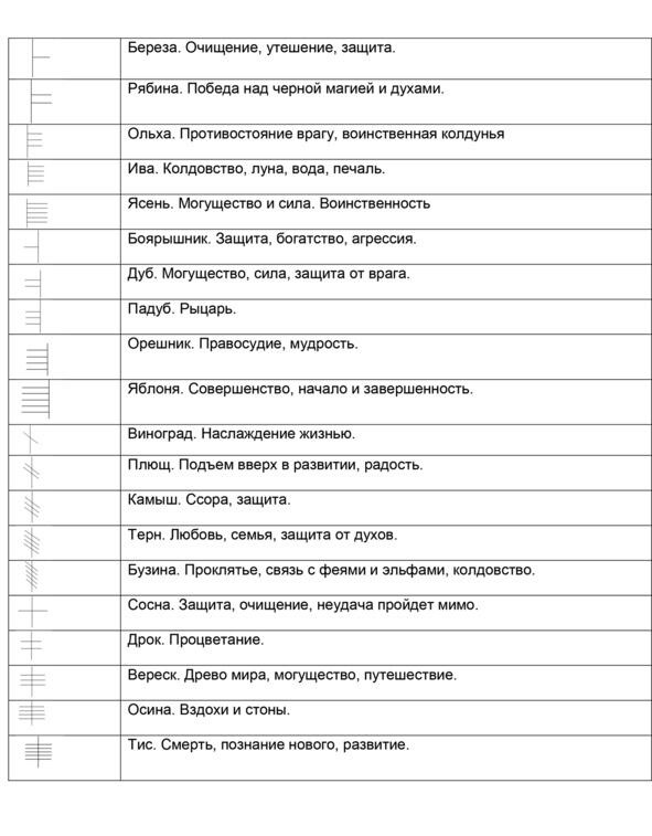 Для гадания изготавливали набор из палочек размером с палец Конин берг. По друидическому алфавиту каждая руна соответствовала дереву.