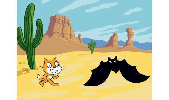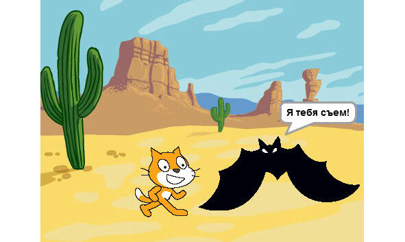 Вот пример небольшого проекта, сделанного второклассником. Это мультфильм про Кота и Летучую мышь. Вот так выглядит сцена до запуска проекта.