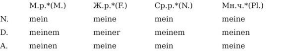 * В немецком языке мужской род называется das Maskulinum, женский род das Femininum, средний род das Neutrum, множественное число der Plural, и соответственно следующие сокращения: M., F., N., Pl.