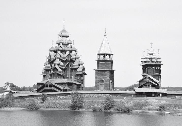 Храм в Кижах, при всей своей уникальности, не так уж одинок в семье русских деревянных церквей. Его «прадедом» можно назвать ни много, ни мало 13-главый деревянный собор Святой Софии Новгородской, построенный в конце X века и сгоревший в 1045 году (илл. 4).