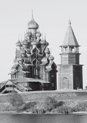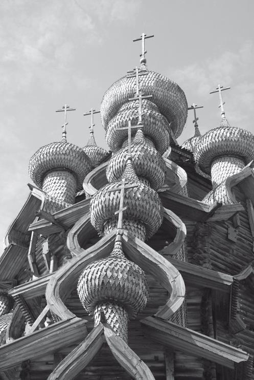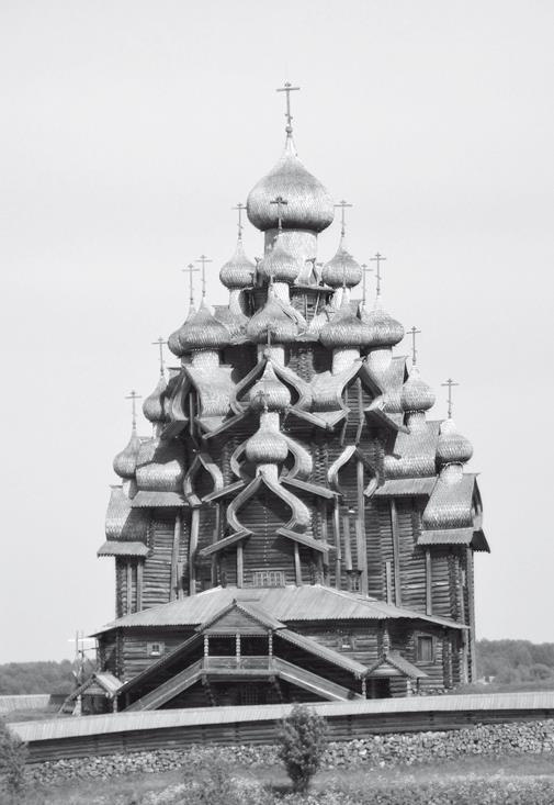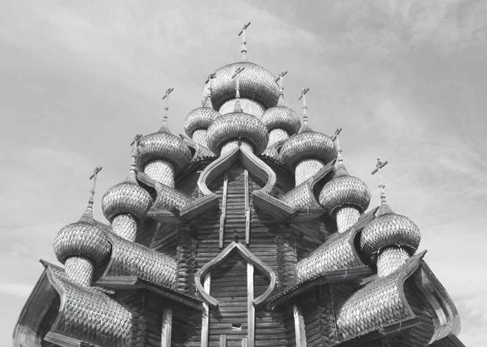 Впрочем, есть еще одна главка внизу она продолжает восточную грань шатра вниз и стоит над алтарной апсидой, приставленной к восточному прирубу (илл. 14). Из-за этого общее количество глав на храме не 21, а 22 (по ярусам: 4+4+8 + 5 и 1 над алтарем). Оно непривычное для русского православного храма четное (!). К тому же алтарная главка как будто нарушает идеальную, просто пифагорейскую взаимную уравновешенность всех храмовых объемов, добавляя к ним еще один объем внизу. Однако именно отступление от полной, внешне легко заметной «рифмованности» основных элементов церковного здания друг другу дало возможность зодчим избежать схематичности в его облике, сделало его еще более живым и загадочным.