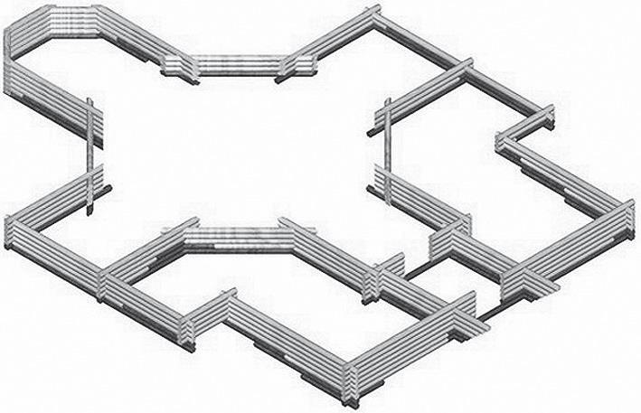 Количество внешних и внутренних стен нижнего восьмерика и прирубов (посчитайте их на плане!) дает в сумме искомые 20. Каждый прируб покрыт двумя бочками с главкой на каждой из бочек. Получается, что снизу храм опоясан кольцом из 8-ми главок, но не сплошным, а разделенным проемами свободными от прирубов гранями восьмерика, поэтому кольцо состоит из 4-х вертикальных пар главок. Грани первого восьмерика, в свою очередь, завершаются бочками, на которых тоже стоят купола-главки (илл. 10).