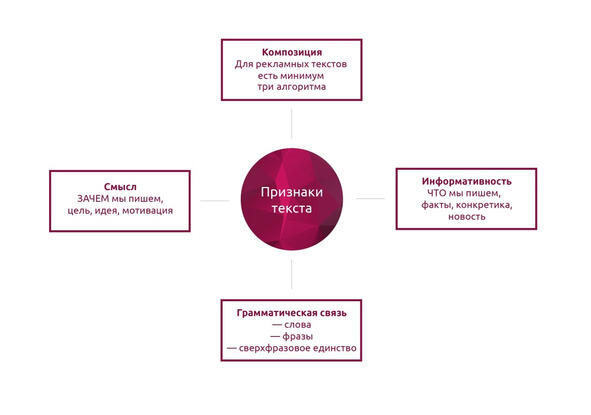 Слова, уложенные в абзац, еще не текст. Даже некоторый словесный контент, который называют текстовым, еще не текст. Есть четыре требования к тексту: грамматическая связь, композиция, смысл и информативность.