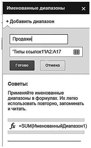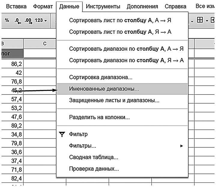 Как и в Excel, диапазонам в Таблицах можно присваивать имена. Именованные диапазоны делают формулы наглядными, ведь вместо