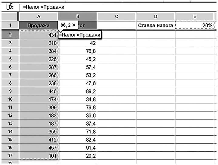 Теперь при вставке строки результат вычисления обнулился, так как формула не стала ссылаться на E2, а осталась на E1: