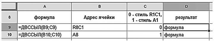 Синтаксис ДВССЫЛ (INDIRECT) состоит из двух аргументов: адреса ячейки и стиля адреса ячейки. Если вы хотите использовать в этой формуле стиль R1C1, то поставьте 0 во втором аргументе.