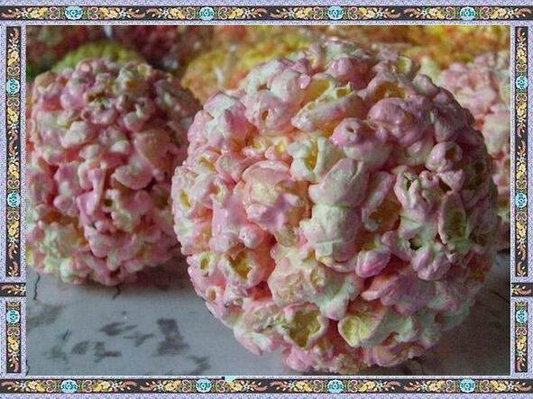 Это розовые или белые шарики из домашнего попкорна склеенные сиропом. «БАТЫ-БУТЫ НА БУТЫЛКИ!» кричали уличные торговцы, предлагая бартер, весьма выгодный детишкам. Бутылку-то можно было где-нибудь подобрать, и не беспокоить родителей.