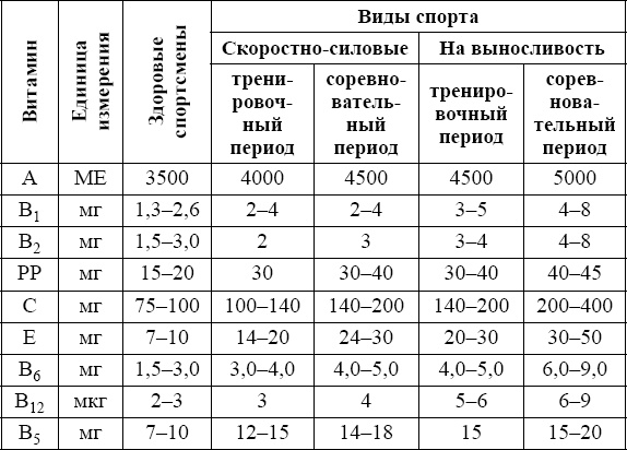 Витамины. Дозы витаминов, рекомендуемые спортсменам в зависимости от направленности тренировочных нагрузок и этапа подготовки, приведены в таблице 3.