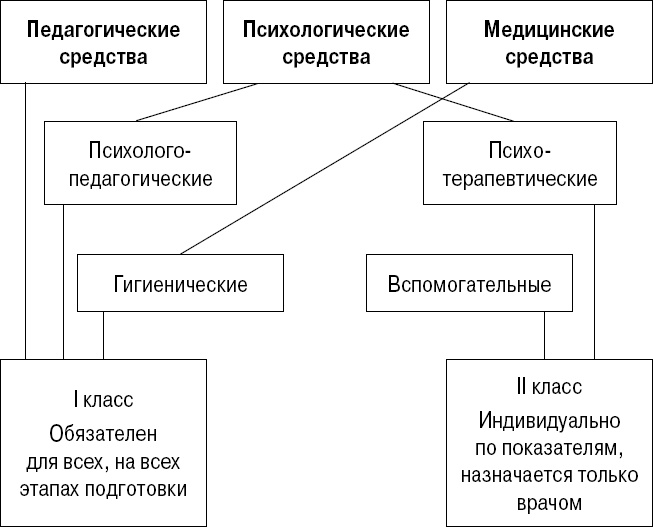 Наиболее обоснованной, на наш взгляд, классификацией используемых в спорте средств восстановления является классификация, предложенная Н. Д. Граевской (1992) рис. 1. И мы совершенно согласны с ее автором относительно особого места среди вышеперечисленных средств и методов восстановления спортсменов педагогических, психологических и гигиенических.