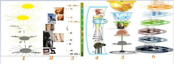 1 Состояние («физика» тела) в области солнечного сплетения. 2 Иллюстрации фаз. 3 цифровая шкала: от 0 до +100 (000), от 0 до 100 (000) 4 «Денежная шкала. 5 шкала «ЧАША ЖИВЫ». 6 Генерирование во вне электромагнитных излучений.