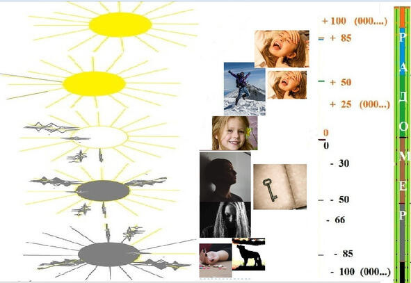 На рисунке преобразования энергий показано: высокие вибрации от середины шкалы нарастают: чем они выше, тем шире амплитуда, мощнее волна), это преобразование низких частот в высокие. И наоборот: вниз от середины шкалы нарастает сила и мощь разрушительной энергии.