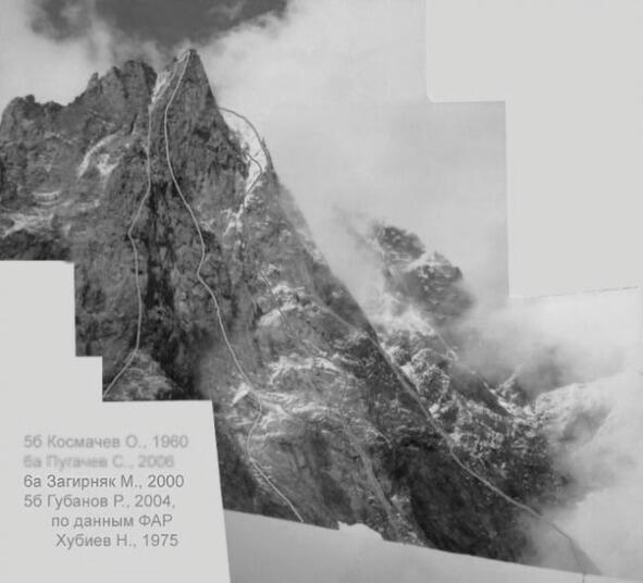 На маршруте было не без приключений. По описанию, а это было вторым прохождением маршрута, там была стена, поэтому я оставил ледоруб и трикони в лагере, а взял с собой азиатские калоши (ну куда же без них) и туристские ботинки. Основными их достоинствами были небольшой вес и дешевизна. Мой напарник, Владимир Яковлев, был из категории топтунов, т.е. мог ходить только по верёвке. С нами шла связка молодых и перспективных: Валера Кузьмук и Володя Охрименко. Им, а я был руководителем, поручил взять трикони и ледорубы, и, как оказалось, это было оптимальным решением. Я быстро пропилил стену в калошах, которая оказалась несложной, там мы заночевали под навесом в трещине. Да, одновременно с нами вышла по восточному гребню на эту же вершину группа мастеров а/л Алибек, и вышли они налегке, потому как планировали сделать гору за день.