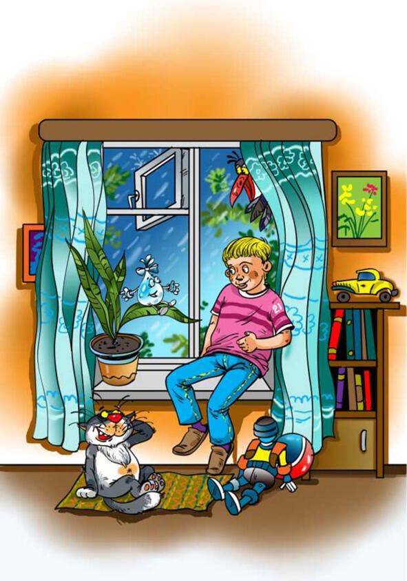 Прошла неделя. Миша читал книжку про Робинзона Крузо. И вдруг забарабанил дождь. Миша бросился к окну. Капля сидела на деревяшке форточки, стучала в стекло и корчила смешные рожи.