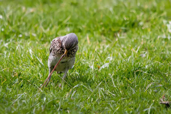 Весной в Москве стоит чуть оттаять земле, как рябинники начинают активно питаться дождевыми червями. Наблюдать за ними в этот период очень интересно. Червей рябинник ищет на слух. Идёт по газону и слушает, наклонив голову набок (рис. 45). Услышав движение червя в земле, дрозд хватает его клювом и начинает тащить из норки. Червяку тоже хочется жить, он сопротивляется, и дрозду нередко приходится тянуть его из всех сил (рис. 46). Обычно единоборство заканчивается победой рябинника, но иногда червяку удаётся всё же выскользнуть.