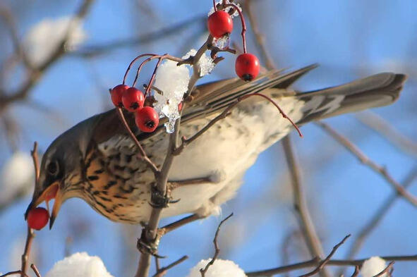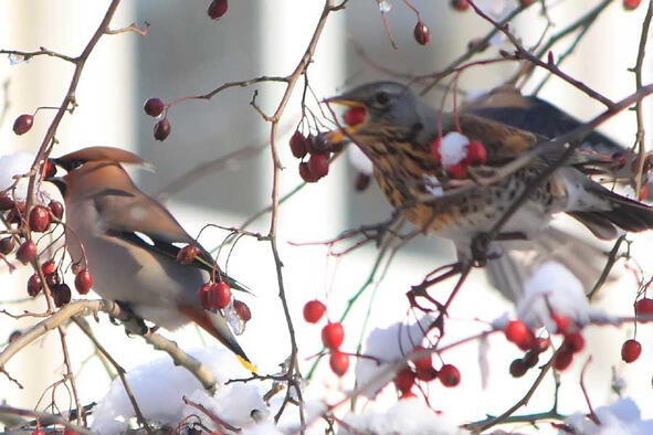 Зимой рябинники кочуют, а если в городе уродился большой урожай ягод рябины, боярышника и других то налетают сотенными стаями и моментально опустошают всё (рис. 47). Часто они клюют ягоды вместе со свиристелями, но в составе разных стай (рис. 48).