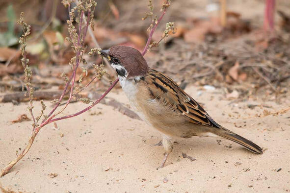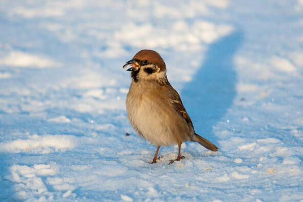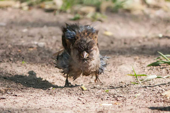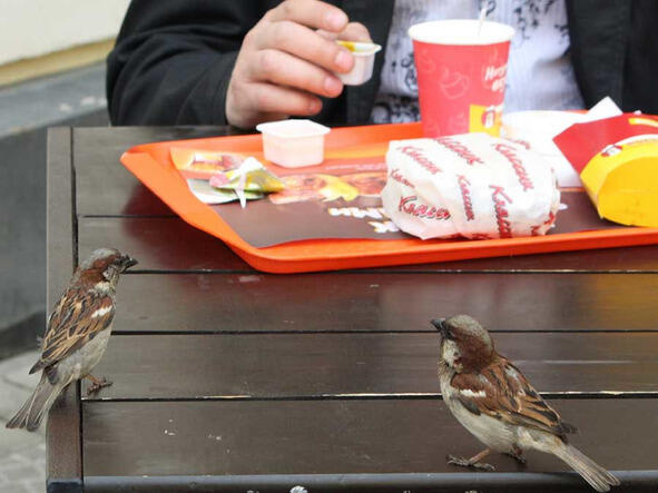 Домовый воробей горожанин. Он тянется не просто к людям, а к их скоплениям. Все, думаю, видели стаи этих птиц на вокзалах прямо под ногами у прохожих, возле уличных кафе, игровых площадок и других подобных мест. Даже голуби не столь назойливы. На рис. 5 воробьи нахально сидят на столике «Макдональдса», да вот клиент им попался жадный: вся еда в пакетиках, откусит кусочек и тут же к себе подвинет. Но есть ведь и добрые крошек дадут. А не дадут, так воробышки сами на столах отыщут. И гнездятся домовые в основном в многоэтажках: и места больше, и людей тоже. К ним все настолько привыкли, что большинство не обращает на них внимания. И зря, потому что у этих птиц присутствует даже мимика наверное, от людей переняли. Это были первые птицы, которых я учился фотографировать (думаю, как и большинство фотоохотников), и в результате скопил целую коллекцию из полутора сотен снимков. На них они ищут еду, греются на утреннем солнышке после холодной ночи, переживают мороз, сжавшись в комочек, пьют воду из лужи, купаются в ней же жарким днём, а если лужи нет, то в пыли, кормят вылетевших птенцов, подбирают материал для гнезда, да и просто чирикают. И всё это с выражением на «лице». Я даже названия подобрал к этим снимкам шуточные. Посмотрите на этого то ли казака, то ли мамелюка на рис. 6: не скажешь даже, что этот идущий в атаку грозный боец простой воробей. На самом-то деле он всего лишь купался в пыли, а затвор камеры щёлкнул в подходящий момент, когда он так живописно взъерошился.