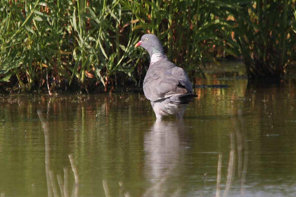 Совсем скрытный образ жизни ведут ещё одни представители семейства: лесные голуби клинтух и вяхирь(Сolumba palumbus). Клинтуха я вообще не встречал, а вяхири живут в лесу возле дачи в Волоколамском районе. Лес этот небольшой, перестоявший, с огромными старыми елями и множеством бурелома. Кого я там только ни встречал, а весной и в начале лета слышатся громкие гнусавые крики: «Ууу-гу, ууу-гу!» Но стоит направиться в сторону крика, как он тут же перемещается и звучит уже в другом месте. Это вяхирь. Иногда они пролетают над домами, тогда их можно рассмотреть. Вяхирь заметно крупнее обычного голубя, по бокам шеи у него белые пятна, хорошо заметные на снимках, сделанных даже с большого расстояния. Сложнее рассмотреть в полёте также белые пятна по верху крыльев, вблизи туловища. Фото на рис. 37 сделано в Крыму в орнитологическом заказнике Астанинские плавни, куда вяхирь прилетел на водопой.