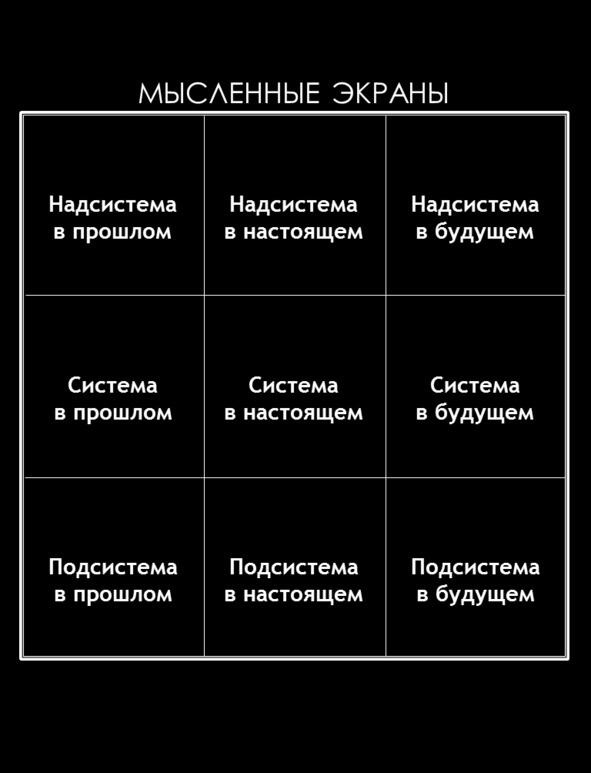 Альтшуллер предлагал мысленно смотреть на изучаемый объект и видеть его как бы на девяти экранах; по горизонтальной оси видеть развитие предмета во времени прошлое, настоящее и будущее (аналог сорита, описанный Войтововым в книге из 90-х «Самоучитель мышления»); по вертикальной оси умение видеть системно: внизу находятся подсистемы, которые входят в изучаемый объект, в середине сам объект как система и вверху надсистема, частью которой он является.